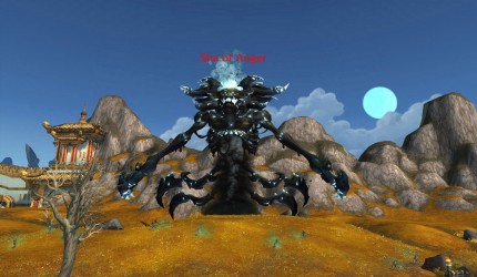 Le Sha de la Colère (Sha of Anger) réside dans les Sommets de Kun-Lai (une zone 87-89). Il ressemble à une espèce de gros scorpion élémentaire et dispose de 348 millions de points de vie. Il semble apparaître aléatoirement parmi plusieurs endroits. Vous ne pourrez d'ailleurs pas le manquer puisque vous pouvez même l'apercevoir se dessiner à l'horizon depuis le nord-ouest de la Forêt de Jade si vous jouez côté Horde. Lorsque le Sha de la colère fait son apparition, les mobs qui se trouvent autour de lui gagnent le buff « Rage du Sha » et deviennent des élites disposant de plusieurs centaines de milliers de points de vie. Chaque point d'apparition différent est lié à différentes créatures : Hozen, Ynglol, Mushan ou Fées. Merci à Dragonwing pour toutes ces précisions et ces images. Vous pouvez par ailleurs retrouver le guide du combat sur MMO-Champion.